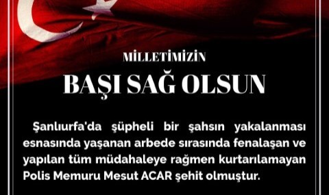Şanlıurfa'da görev sırasında rahatsızlanarak şehit olan polis memuru Mesut Acar için Eskişehir Emniyet Müdürlüğü tarafından taziye mesajı yayımlandı. Şanlıurfa'da bir şahsın yakalanması sırasında meydana gelen arbedede rahatsızlanan Acar, hastaneye kaldırılmış ancak yapılan tüm müdahalelere rağmen kurtarılamayarak şehit olmuştur.